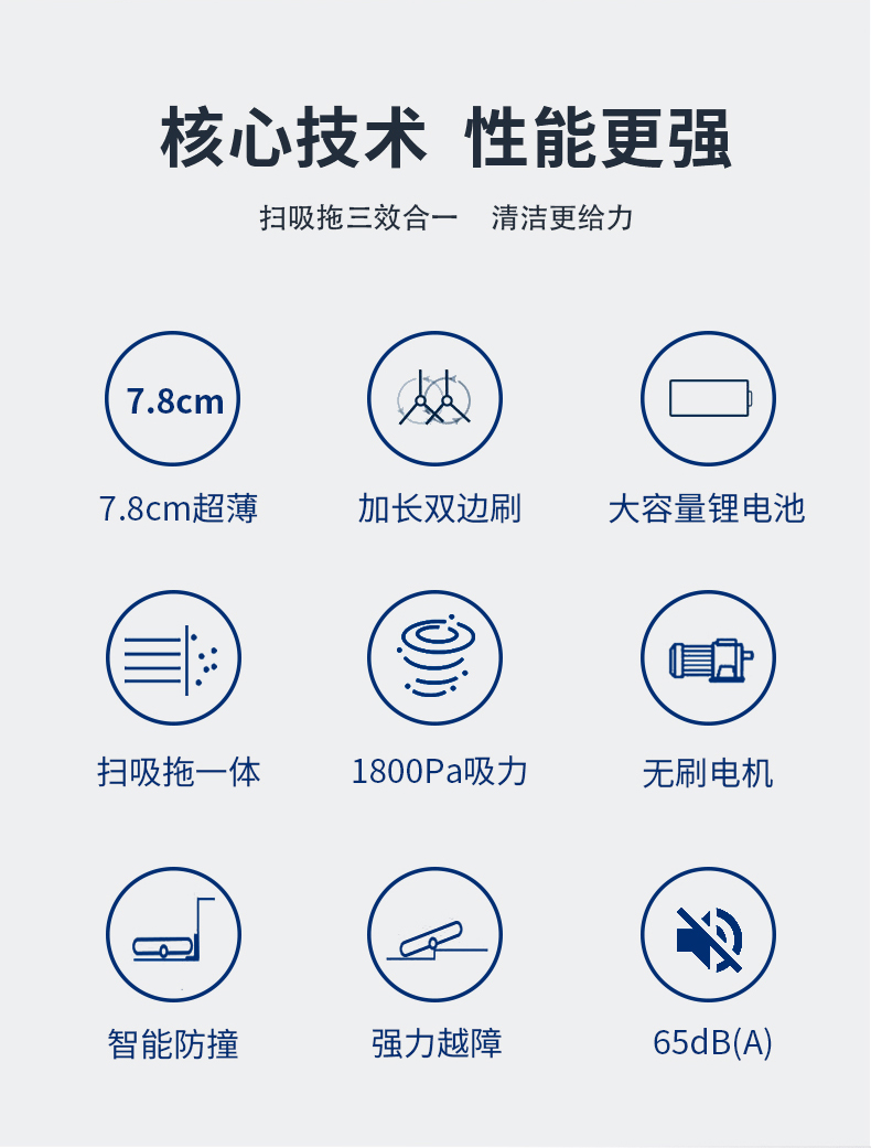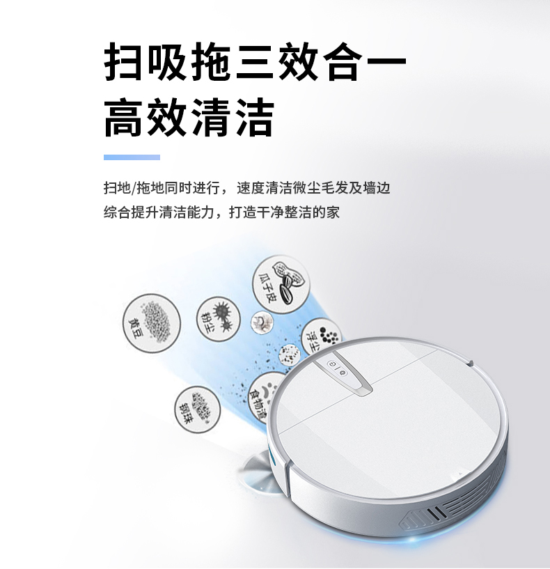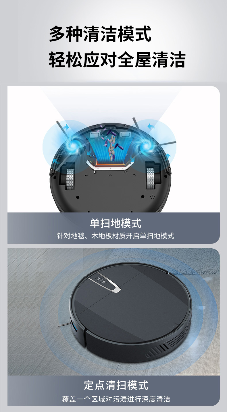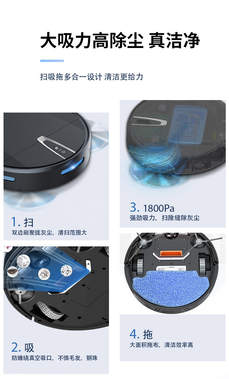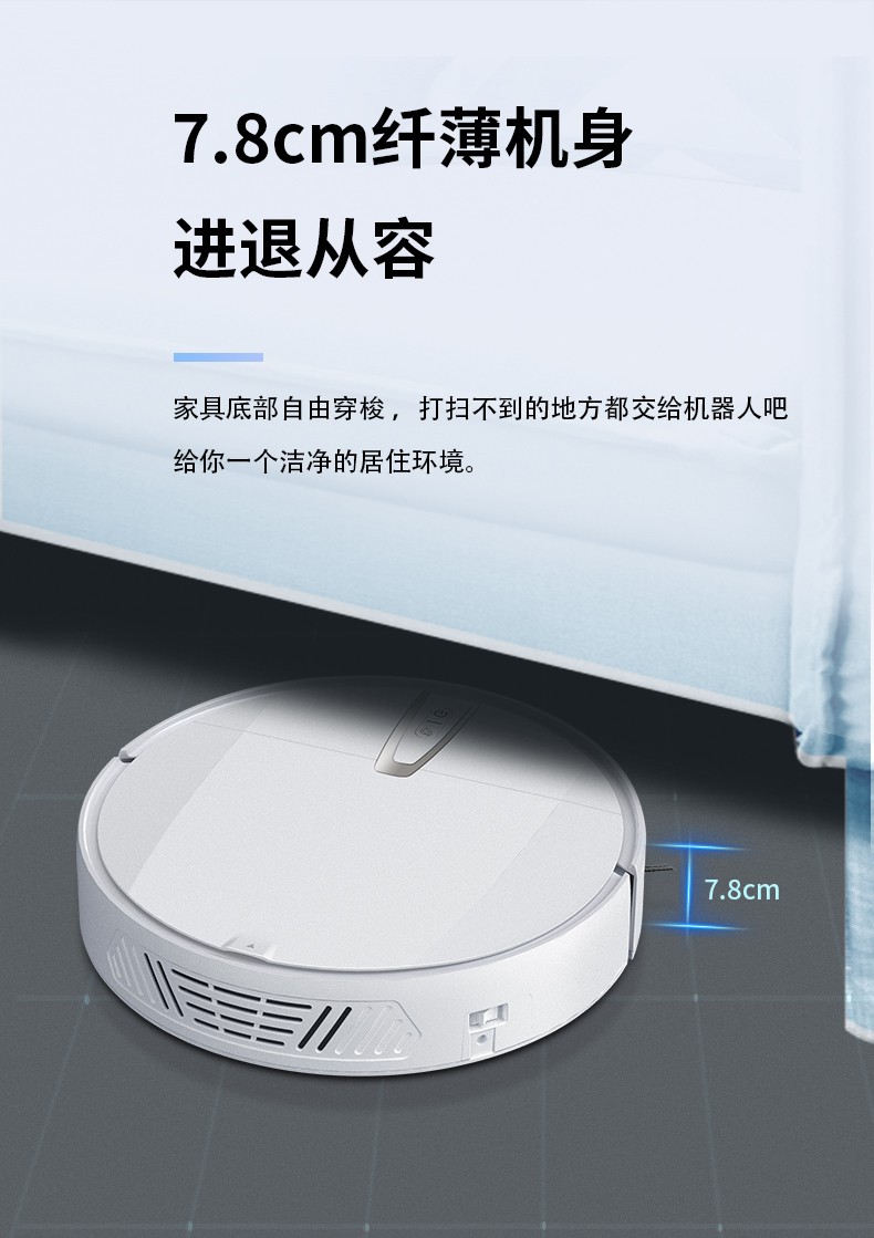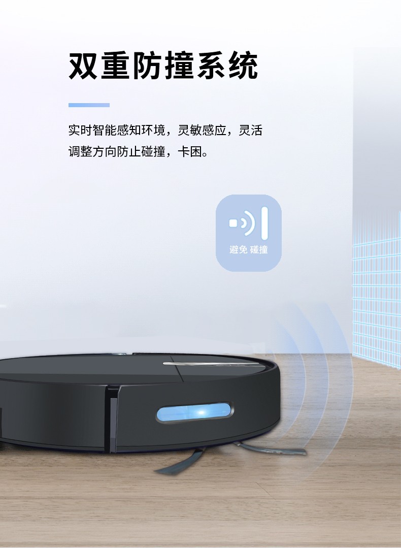 大吸力高除塵雙邊刷聚攏灰塵,清掃范圍大,1800Pa強(qiáng)勁吸力掃除縫隙灰塵,防纏繞真空吸口不懼毛發(fā)鋼珠,大面積拖布清潔效率更高。雙重防撞系統(tǒng)實(shí)時(shí)智能感知環(huán)境,靈敏感應(yīng)靈活調(diào)整方向防止碰撞卡困。7.8cm纖薄機(jī)身家具底部自由穿梭。智能感應(yīng)高度落差,防止跌落3組防摔感應(yīng)裝置,均勻分布在底部不必?fù)?dān)心機(jī)器人會(huì)跌落。貼地濕拖前后拖更高效,恒壓貼地濕拖摻水均勻深度清潔。2600mAh大容量鋰電池,高能量密度鋰電池可實(shí)現(xiàn),多種清潔模式輕松應(yīng)對(duì)全屋清潔。無(wú)刷電機(jī)吸力高達(dá)1800Pa強(qiáng)勁除塵。600ml大容量塵盒采用內(nèi)置HEPA三層過(guò)濾系統(tǒng)防止漏灰二次污染。