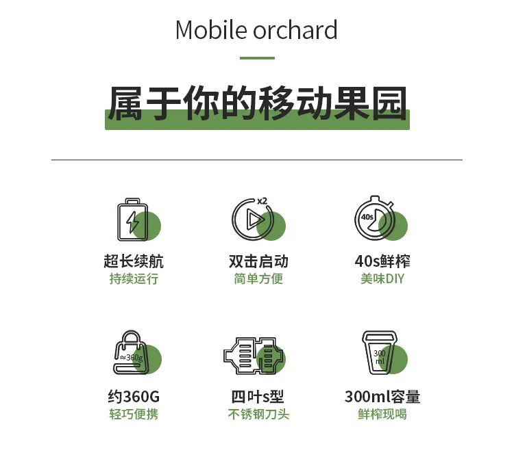 4、304食品級(jí)不銹鋼一字刀頭均勻切碎果汁細(xì)膩,300ml精致容量輕松入袋整機(jī)僅370g,不含雙酚A加厚食品級(jí)PC材質(zhì)。