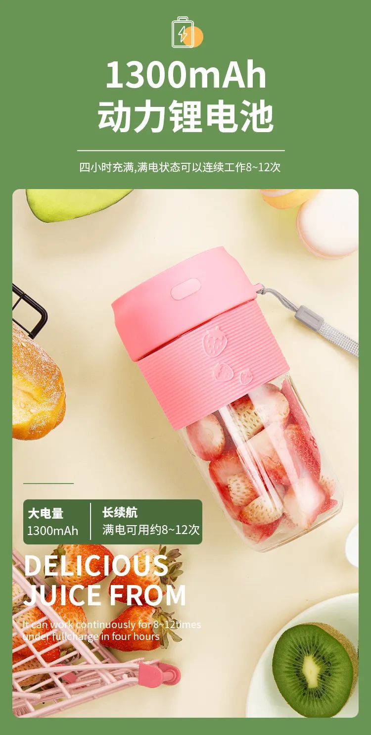2、無(wú)線便攜榨汁杯配置大電池1300mAh,充電時(shí)長(zhǎng)4h鮮榨次數(shù)12次,