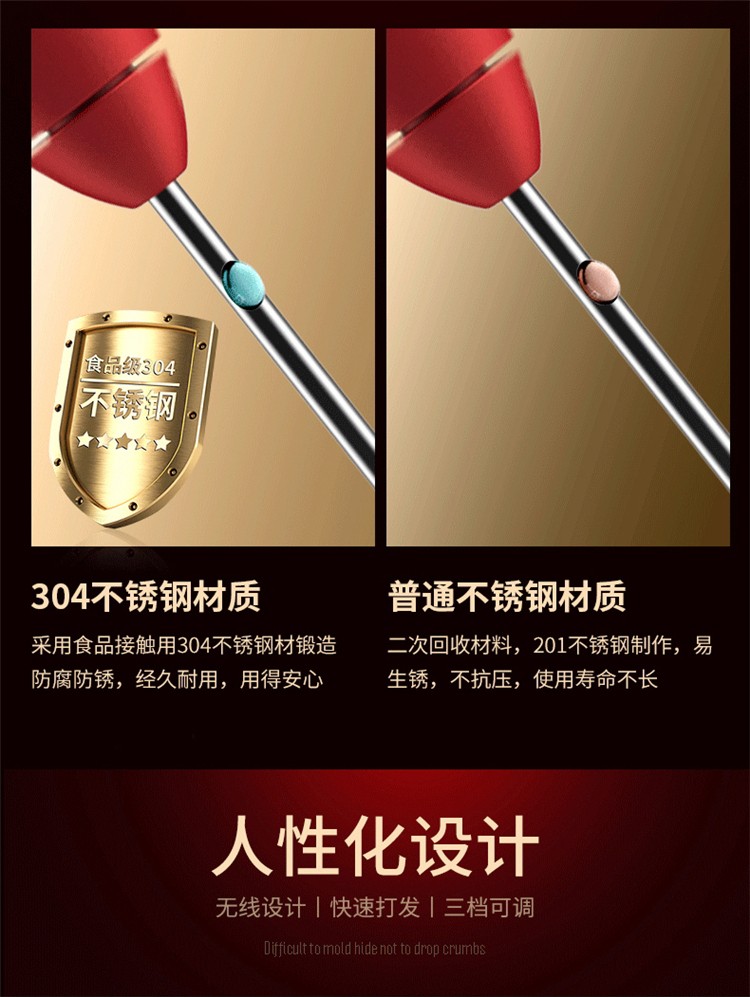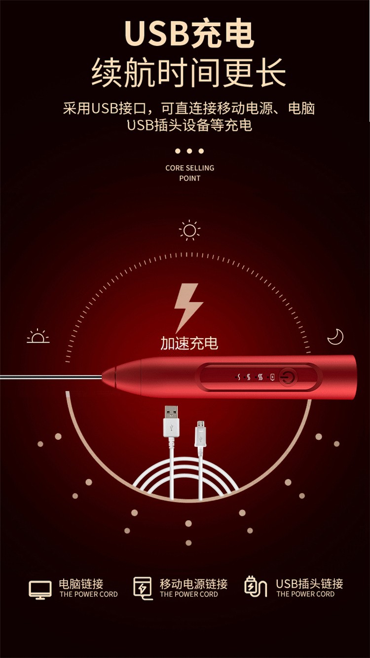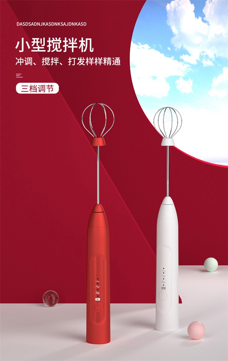 多功能便攜打蛋器小型攪拌機,沖調(diào),攪拌,大發(fā)樣樣精通,304不銹鋼材質(zhì)不易發(fā)霉,不易藏污,不掉紙屑。人性化設(shè)計無線設(shè)計,快速大發(fā),三擋可調(diào),無線設(shè)計擺脫電線約束,三擋可調(diào)匹配不同食材的大發(fā),本擋力度可調(diào),滿足多種烘焙攪拌力度多種食材材質(zhì)均勻大發(fā)。強勁馬達(dá)渦旋機芯組動力十足,強勁動力。全銅打造負(fù)荷能力強效率更高,USB充電續(xù)航時間更長,可直接連接移動電源,電腦USB插頭設(shè)備充電。靜音運行低至30dB分貝,采用避震設(shè)計能夠減少噪音打蛋不再吵鬧。極易清洗一沖即凈,無需技巧安裝/拆卸,舒適手柄設(shè)計。